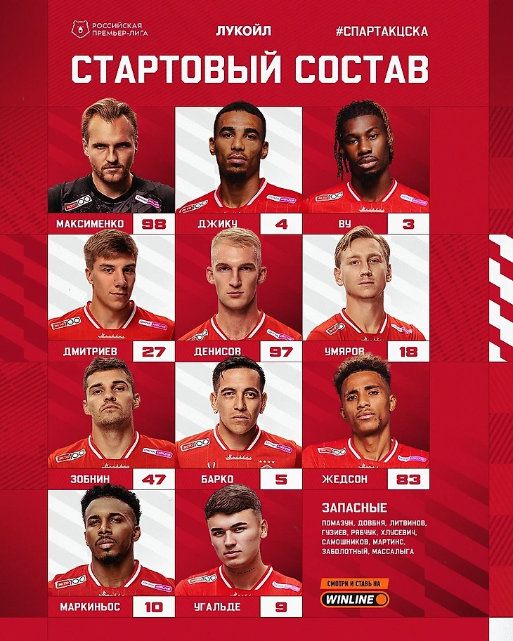 «Спартак»: Максименко , Ву, Джику, Дмитриев, Денисов, Умяров, Жедсон, Зобнин (к), Барко, Маркиньос, Угальде.