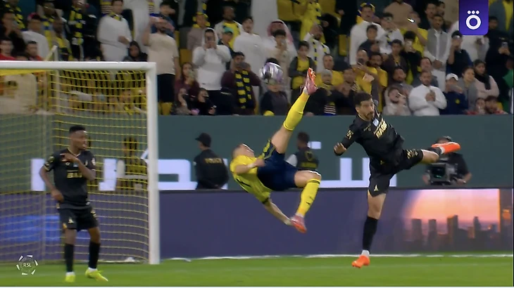 Криштиану Роналду забивает через себя в любом возрасте! На этот раз показал чудеса акробатики в матче с «Аль-Халиджем» (4:1). Положил красоту в самом конце, когда «Аль-Наср» уже вел 3:1. До него отличились Жоау Феликс, Уэсли Гассова и Садьо Мане. На 90+6 включился и Криш – причем как!