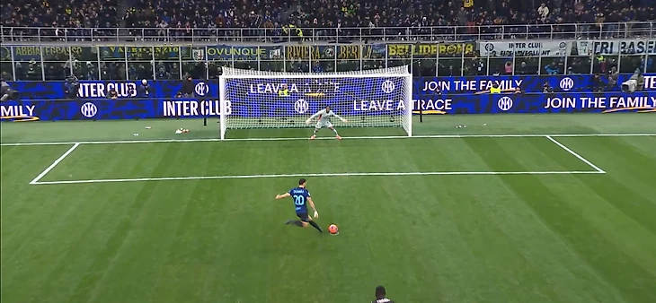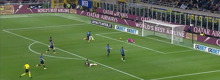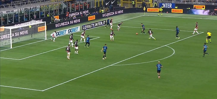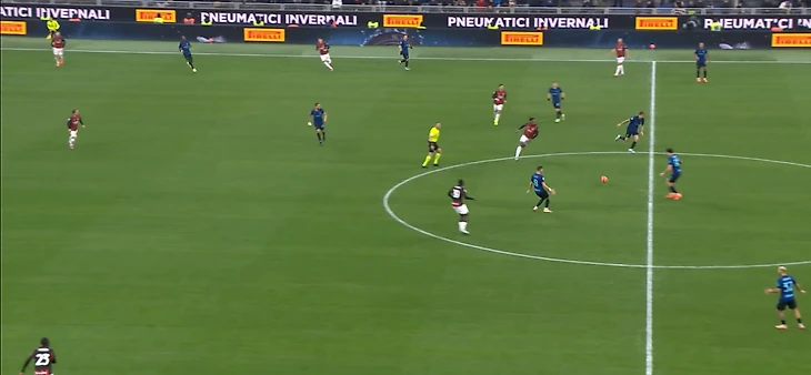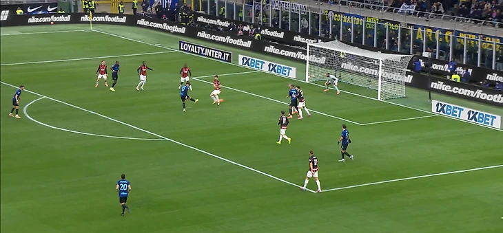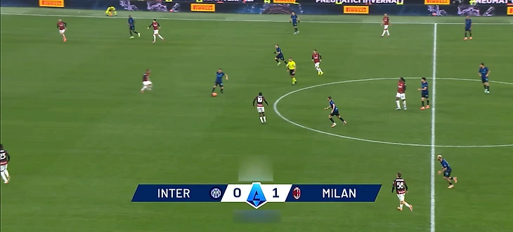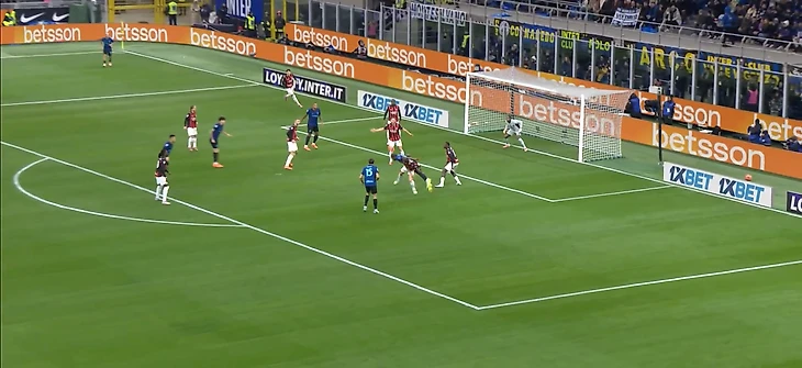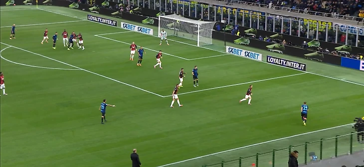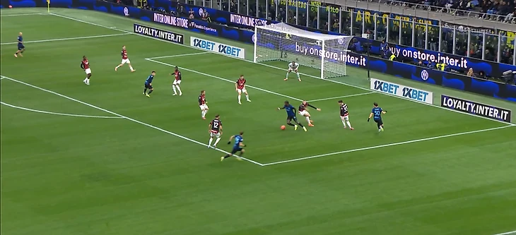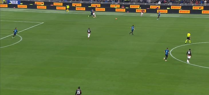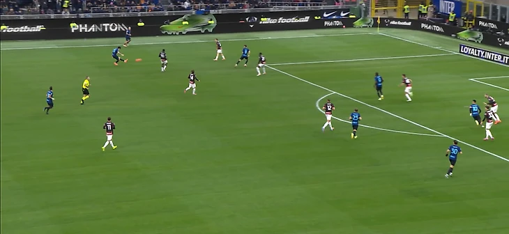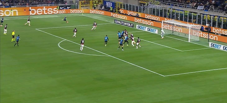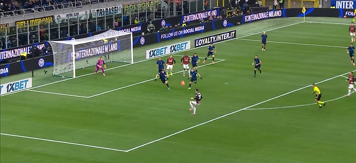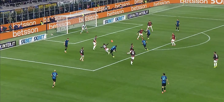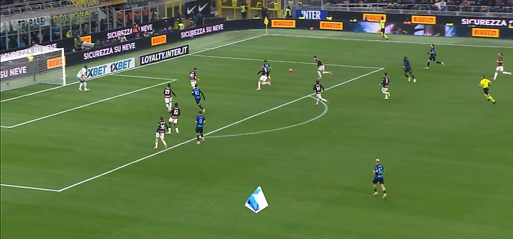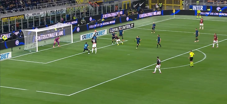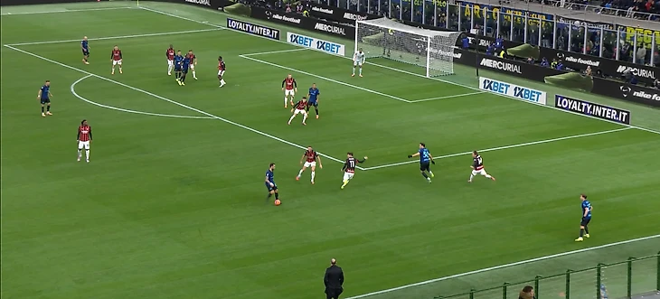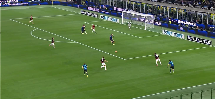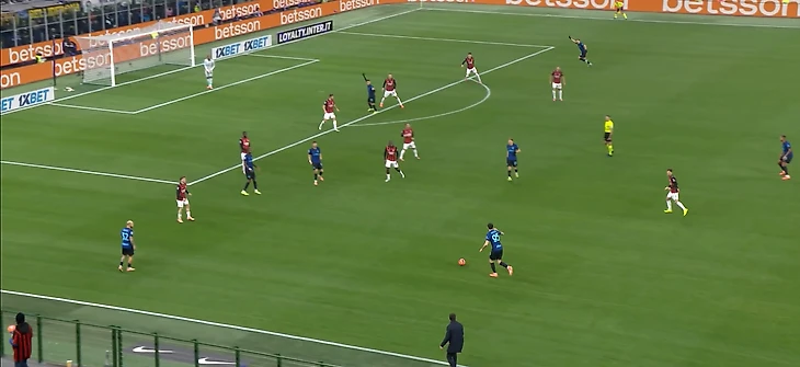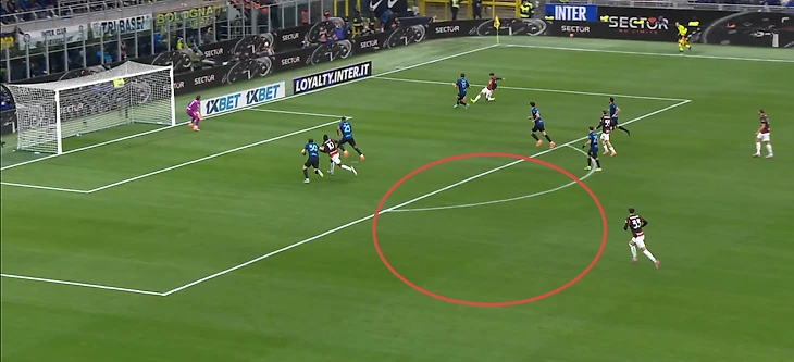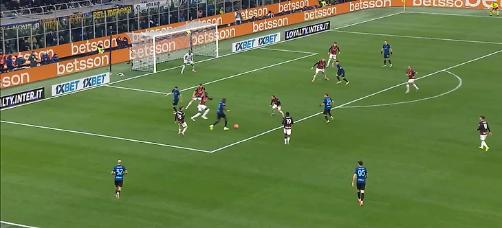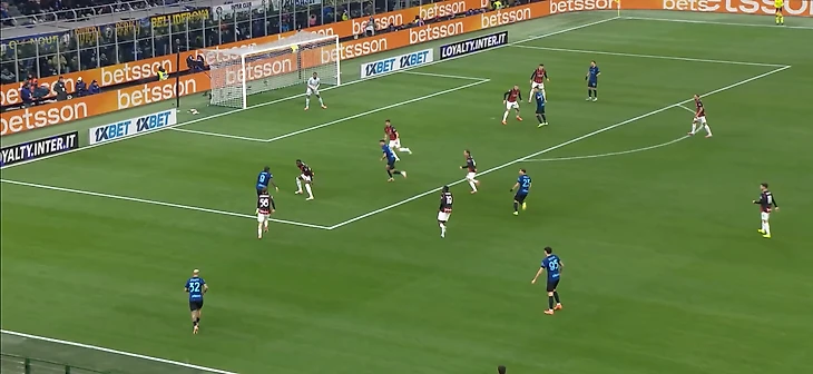 Также «Интер» способен заходить в штрафную через передачи низом. В этом эпизоде стоит отметить недостаточно плотную игру в обороне «Милана» и отличное движение Сучича, который увел за собой Габбию, убрав подстраховку Томори и открыв угол для удара Тюрама.