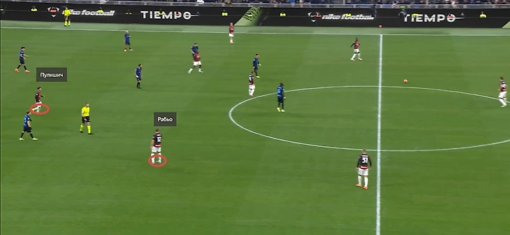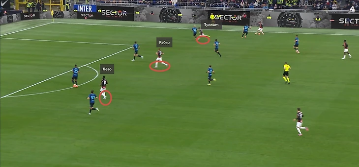 «Билдап» «россонери» менее выстроен в данном матче, некоторые паттерны при розыгрыше команда опустила (например, сценарии, когда Модрич опускается в тройку, из-за чего происходили вертикальные перемещения на левом фланге команды). Из-за чего в нем есть несколько работающих механик, но в большинстве случаев он основан на импровизации. Чтобы систематизировать данные приемы, необходимо добавить контекст. Во-первых, пара нападающих Леау и Пулишич, которые по своим паттернам различаются, но зона обитания каждого из них при игре в паре нападающих – левый полуфланг, что делает еще больший акцент на этой зоне. При этом ни один из них не является успешным игроком-ориентиром для длинных передач, что делает данную связку еще менее вариативной. Во-вторых, важно отметить возвращение Рабьо, который дает абсолютно иные качества на позиции 8-ки, а именно больше вертикальных рывков и способность бороться на втором этаже. Так Адриен мог из глубины подключиться к атаке команды, оказавшись по итогу на позиции центрального нападающего, при этом часто взаимодействуя с Пулишичем, давая возможность американскому футболисту опускаться за мячом в глубину.