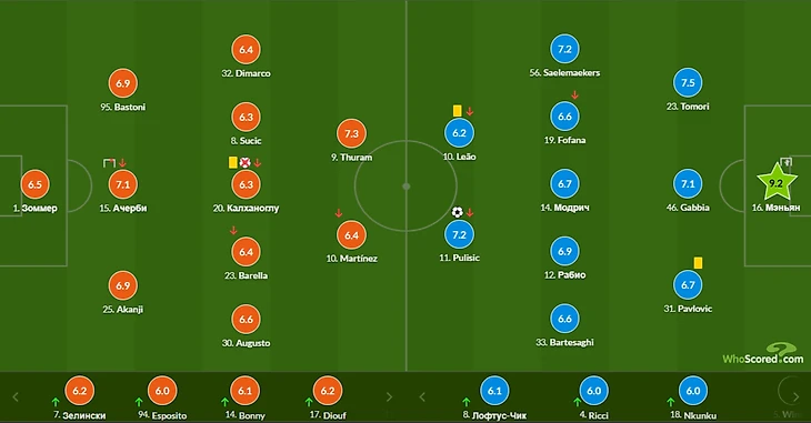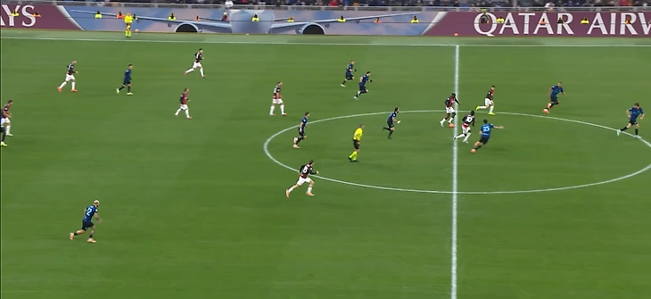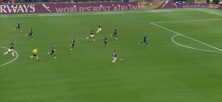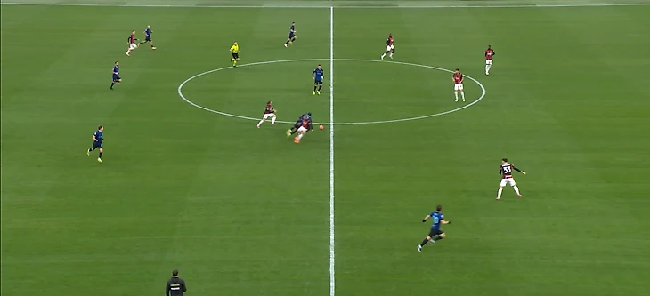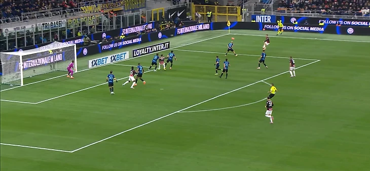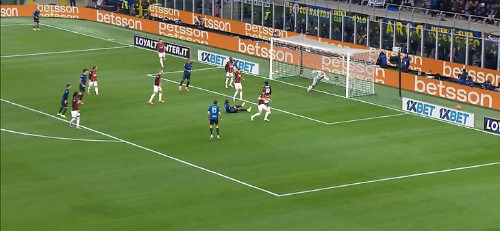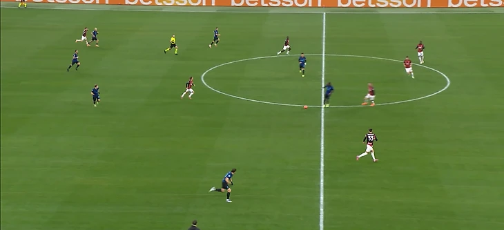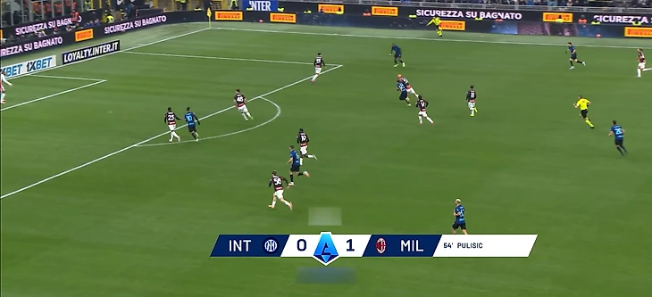 Гол «Милана» пришел после ситуации перехода владения, которую инициировал «Интер» выносом от ворот. В эпизоде, помимо потери Чалханоглу, стоит отметить странную, по меньшей мере, игру Аканджи, который обернулся, чтобы оценить ситуацию за спиной, но при этом не предпринял никаких действий, создав пространство для открывания Пулишичу, и слабую игру Зоммера, отбившего мяч перед собой. Игроки «Милана» оказались в своей стихии, грамотно разбежавшись, не потеряв темп и ширину атаки.