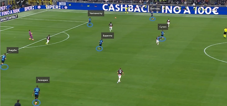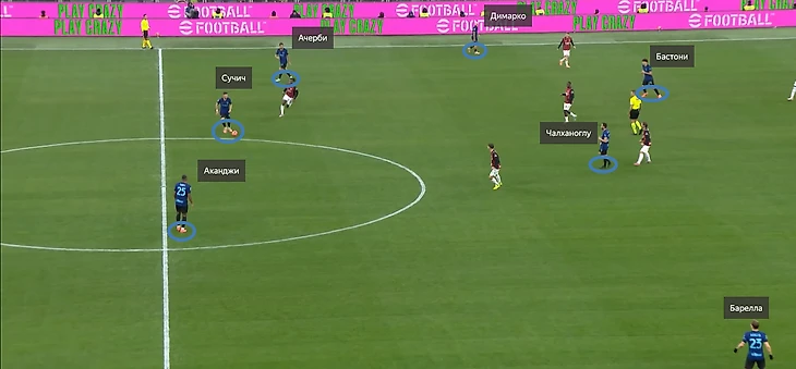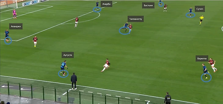 Чалханоглу спускался для розыгрыша мяча, Бастони уходил в ширину, Димарко поднимался, Барелла и Сучич действовали в своих полуфлангах. Во второй стадии билдапа, в зависимости от полуфланга, происходили следующие движения: если атака с левого полуфланга, то Чалханоглу совершает вертикальное движение в 14-ю зону для подбора, Сучич в полуфланге создает пространство и «открытый мяч» для Бастони/Димарко; если зона переполнена, то в качестве помощника сюда с противоположного фланга приходит Барелла; если ситуация с «открытым мячом» легко образовывалась, то Барелла совершает диагональные движения в штрафную. Если атака развивается через правый полуфланг, то диагональное движение в штрафную совершает Сучич, в роли подающего выступает Барелла, Аугусто создает ширину.