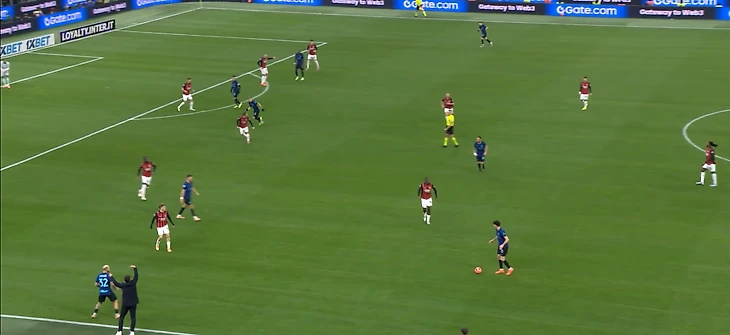 Стоит отметить, что попытки прессинга «Милана» весьма легко преодолевались хозяевами, из-за чего гости чаще откатывались в средний блок и играли по мячу. В связи с чем «билдап» «Интера» в большинстве атак приобретал следующий вид: