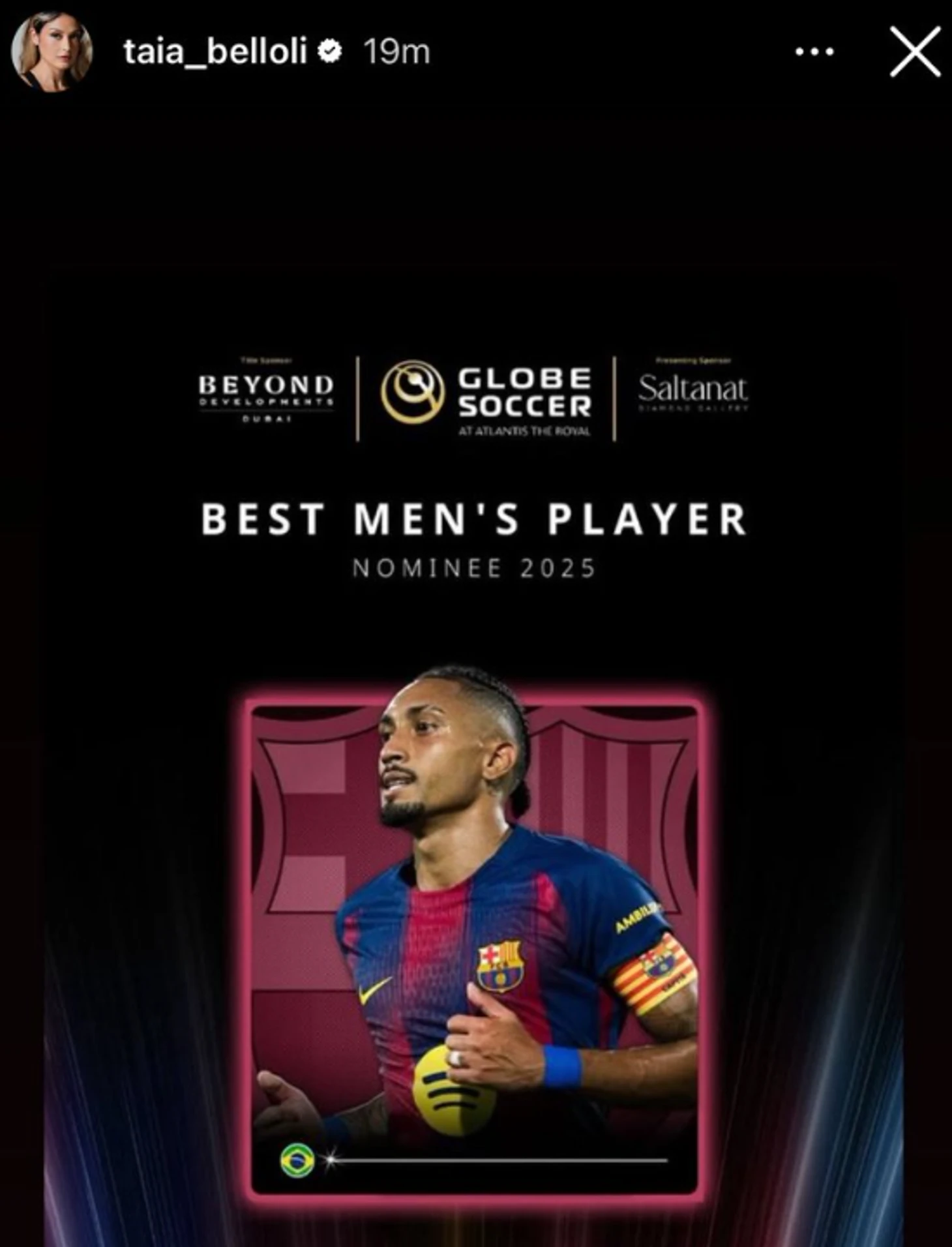 Жена Рафиньи Наталья Беллоли выложила пост в сторис, где бразилец указан как номинант на премию Best Men’s Player 2025 от Globe Soccer Awards.