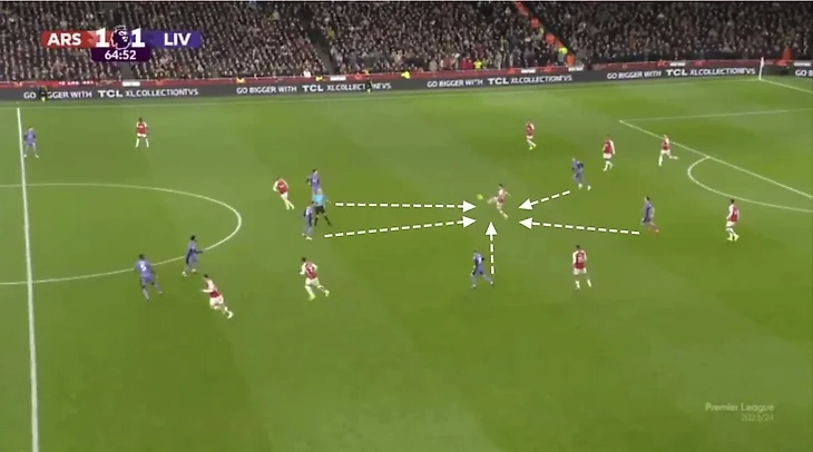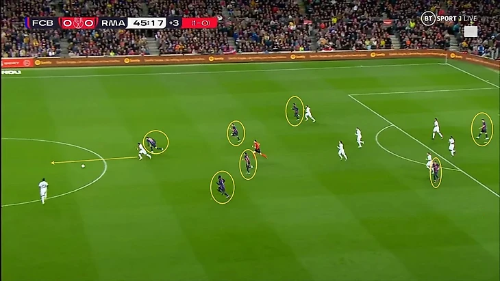 В первые 3 секунды после потери мяча, ближайшие 3-4 игрока немедленно окружали владеющего мячом, создавая численный перевес