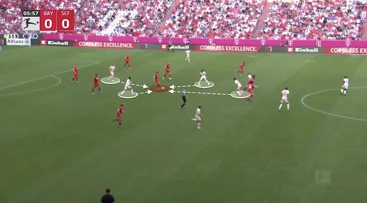 Как это работает: «Бавария» часто намеренно отступает, компактно занимает свои позиции в центре поля и провоцирует соперника на передачу в определенную зону (обычно на фланг или на слабо владеющего мячом игрока). Как только передача совершена — срабатывает «капкан».