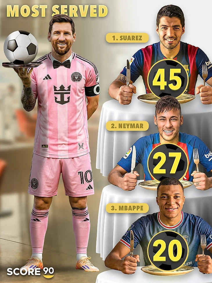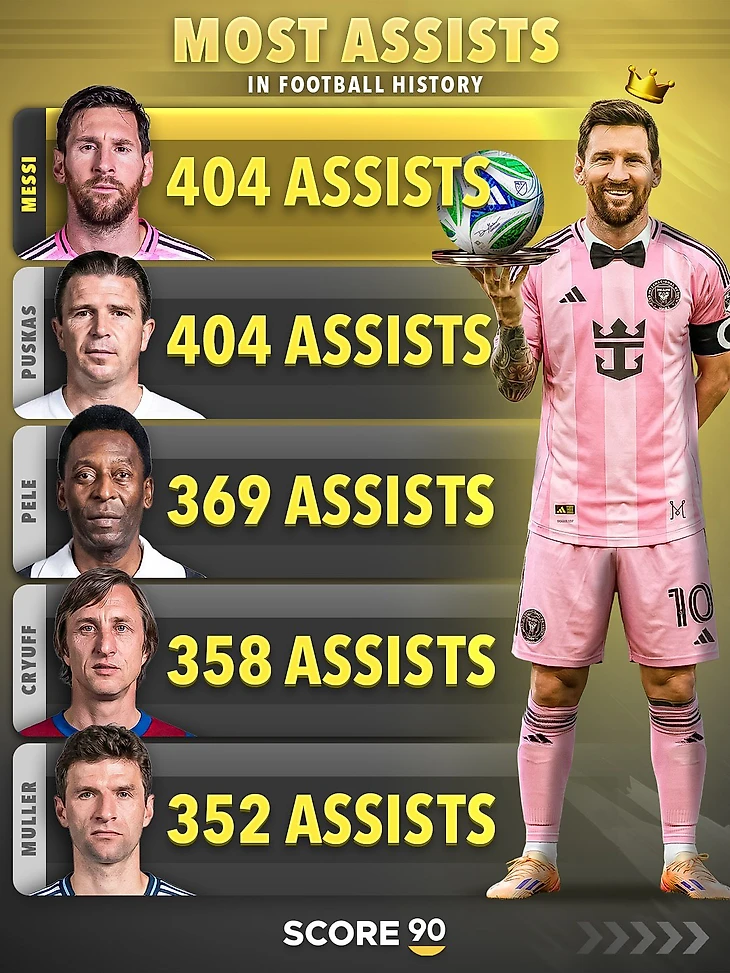 Хет-трик из голевых передач делает Лионеля одним из двух лучших ассистентов в истории футбола, первую строчку аргентинец делит с Ференцем Пушкашем. Следом идут не менее великие Пеле и Йохан Кройфф. Замыкает топ-5 Томас Мюллер, немец вместе с Месси – единственные действующие игроки, попавшие в солидный рейтинг.