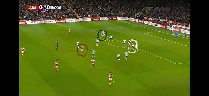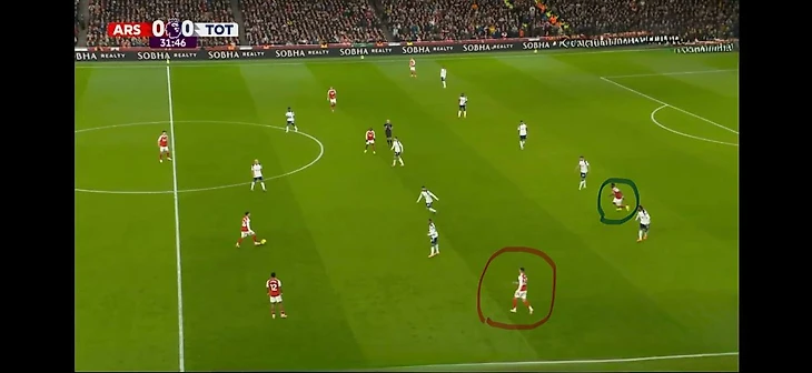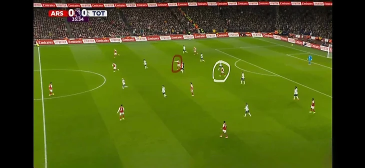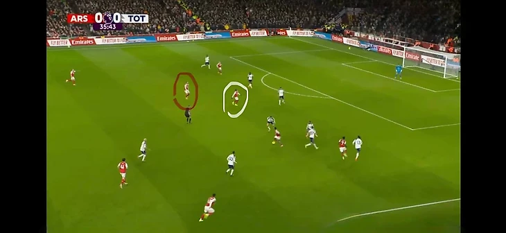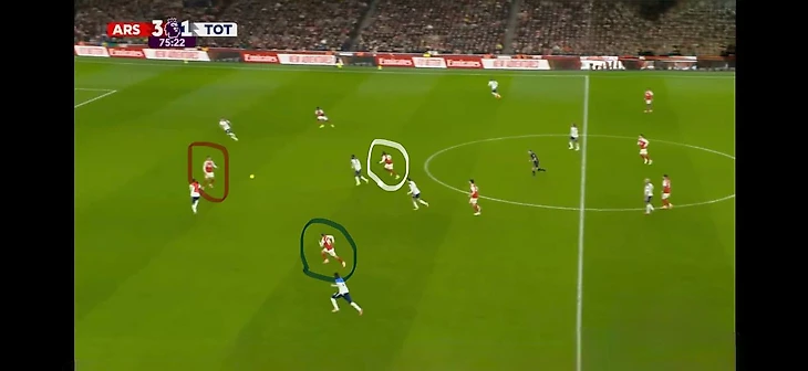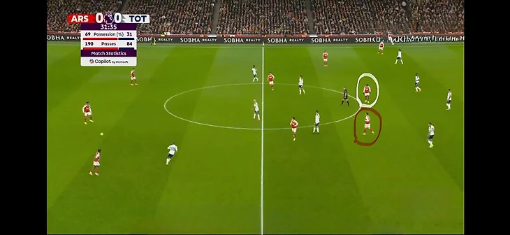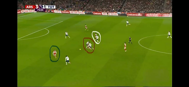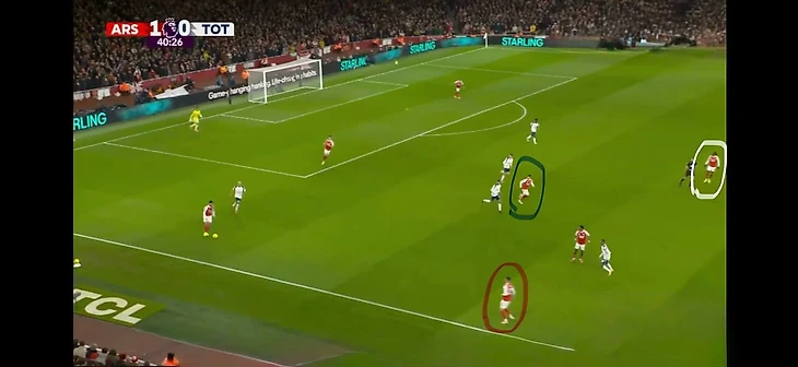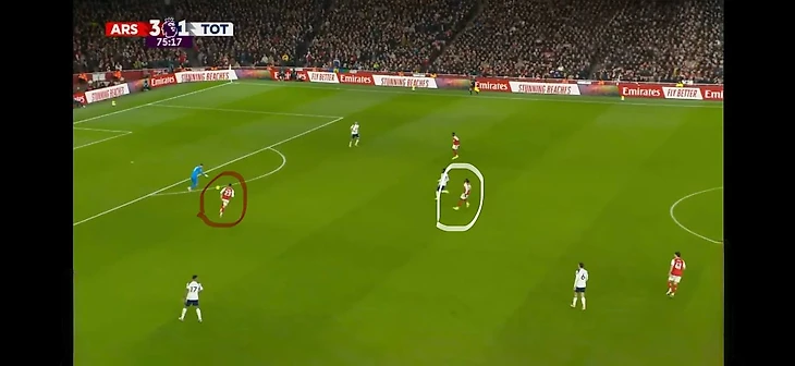 Ещё одним козырем Микеля Мерино является его работоспособность. В нашем посте мы не стали подробно анализировать прессинг «Арсенала», так как схема первого тайма «Тоттенхэма» предполагала быстрый и вертикальный футбол, отчего часто лицезрели длинные передачи, которые с лёгкостью прикусывали рослые защитники «канониров», но а если гости и пытались играть низом, то «красные» быстро выдавливали «белых» во фланги, откуда не оставалось выхода, кроме как пулять вперёд, где снова на втором этаже сильнее доминаторы. На рисунке №9 показано, как Мерино (красный) грамотно загнал Викарио под нерабочую левую ногу и заставил неточно вынести вперёд, с чего началось развитие хет-трика Эзе (белый).