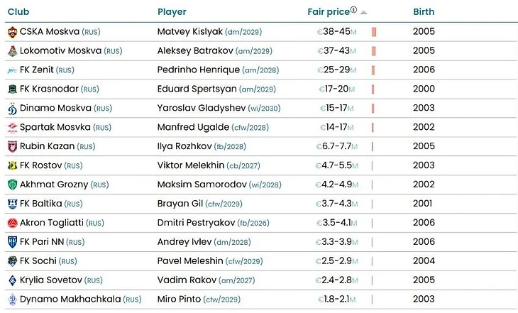 По версии CIES, самым дорогим игроком чемпионата России является полузащитник ЦСКА Матвей Кисляк. Источник оценивает его в € 38-45 млн. На втором месте располагается хавбек «Локомотива» Алексей Батраков (€ 37-43 млн), тройку лидеров замыкает вингер «Зенита» Педро (€ 25-29 млн).