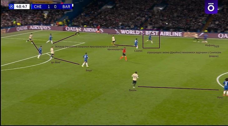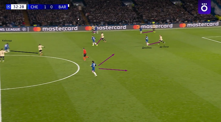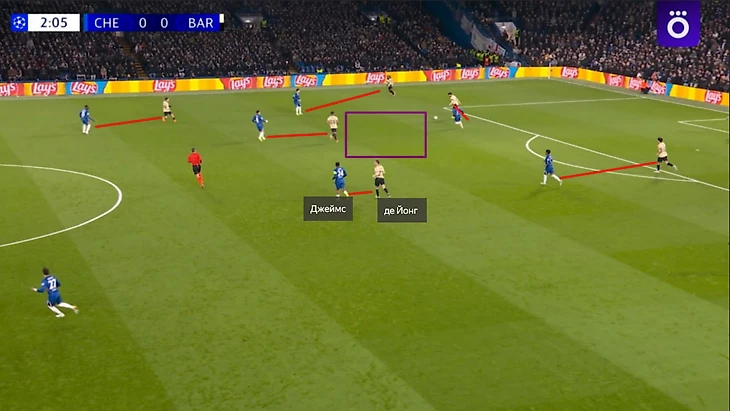 Вообще, в этом матче «Челси» делал много неудобного для «Барселоны» в давлении: прессинговал до упора, активизировал давление при получении мяча со стороны Араухо, так еще и в последней линии умело передавал опеку, что давало дополнительного страхующего игрока в момент переходной фазы. Удивительно, но «Барселона» ничего противопоставить не смогла, и не только в этом компоненте.