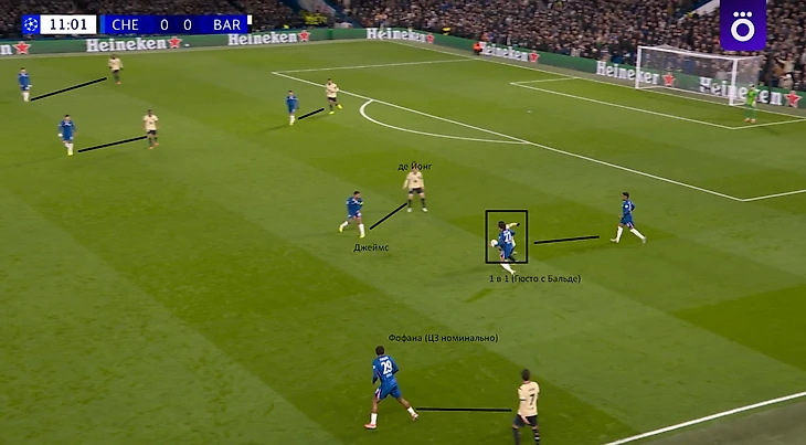 С учетом того, что «Барселона» играла в меньшинстве, структура выпада зависела от индивидуальных скиллов при розыгрыше (не хватало Педри и Кристенсена изначально) – вариация провалилась количественно и качественно, «Челси» легко адаптировался к более простому продвижению с сохранением главных принципов, после определенных попыток команда Флика отдала мяч.