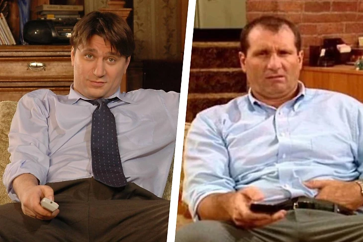 «Счастливы вместе» – это российская адаптация сериала «Женаты…с детьми». Это был первый собственный проект телеканала «ТнТ», который мы сегодня знаем, как одного из лидеров собственного сериального контента. Американцы изначально разрешили только переснимать серии, причём буквально, а не создавать новые. Отсюда у Букина двухэтажная квартира и прочие, чисто, американские стереотипы.