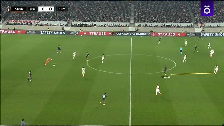 Ларин имел важную роль и в игре с мячом. Нападающий сильно повлиял на выработку «гормона стресса» у защитников «Штутгарта» — Кайл играл блуждающего полузащитника под нападающими. Отваливался в центр поля, заполнял последнюю линию, сваливался на фланги — классический для современного футбола игрок-заноза, отравляющий персональный прессинг любого соперника.
