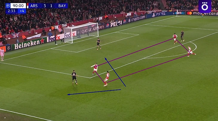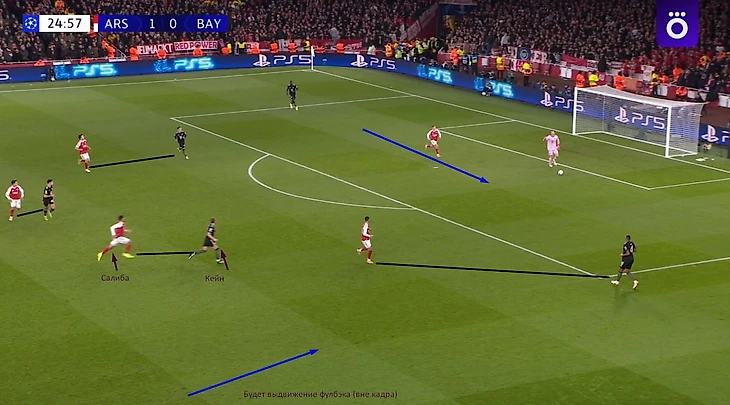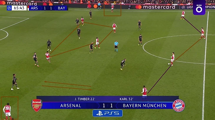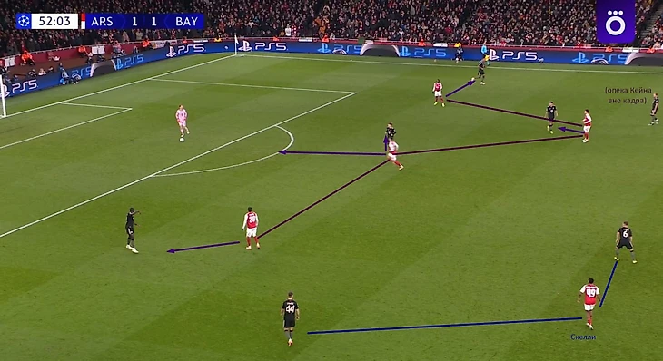 Коллектив Артеты смог навязать неудобный для «мюнхенцев» рисунок, забрав себе мяч, начав более активно давить в зону мяча (уже противоположно) и менее активно использовать вертикальные розыгрыши – акцент на универсальное переполнении зон при продвижении мяча низом поломал прессинг «Баварии», пришлось оставлять возможности на мяче для возможностей большей надежности.