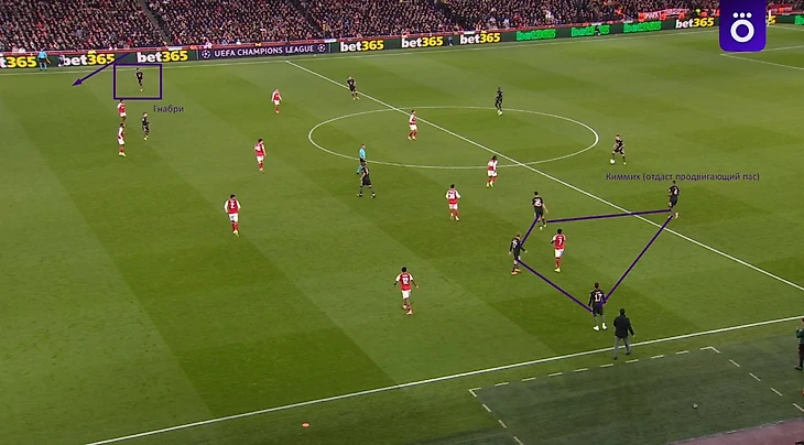 Опять же, у «Баварии» получалось продвигать мяч лишь за счет вертикализации игры или же перегруза определенной зоны (что не всегда выглядело стабильно): вариация соперника была плотна и адаптирована, что удобно ложилось на возможности «Арсенала» (более хаотичная игра в атаке) и рисунок матча.