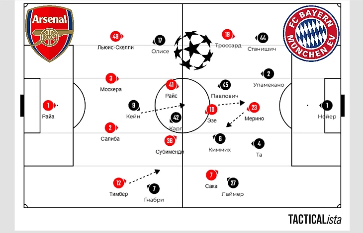 «Арсенал» же очень грамотно выступал и в переходных фазах (прессинг стал еще активнее), умело исходил из качеств своих игроков на мяче и своевременно адаптировал структуру под плотную, но достаточно разобранную по исполнению вариацию «Баварии» (по-другому давить на данную вариацию «Арсенала» было невозможно).