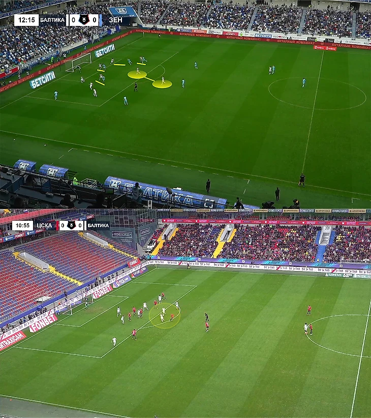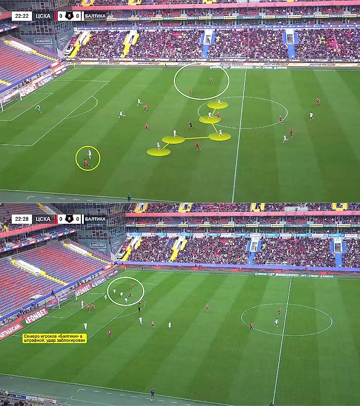 «Балтика» – одна из лучших команд по обороне в штрафной. Игроки понимают, из каких зон рождаются голы – следствие качественного тренировочного процесса. Например, оцените, как команда быстро вернулась в этом эпизоде: на дальнем фланге два игрока ЦСКА открыты, а через шесть секунд их заблокировали.