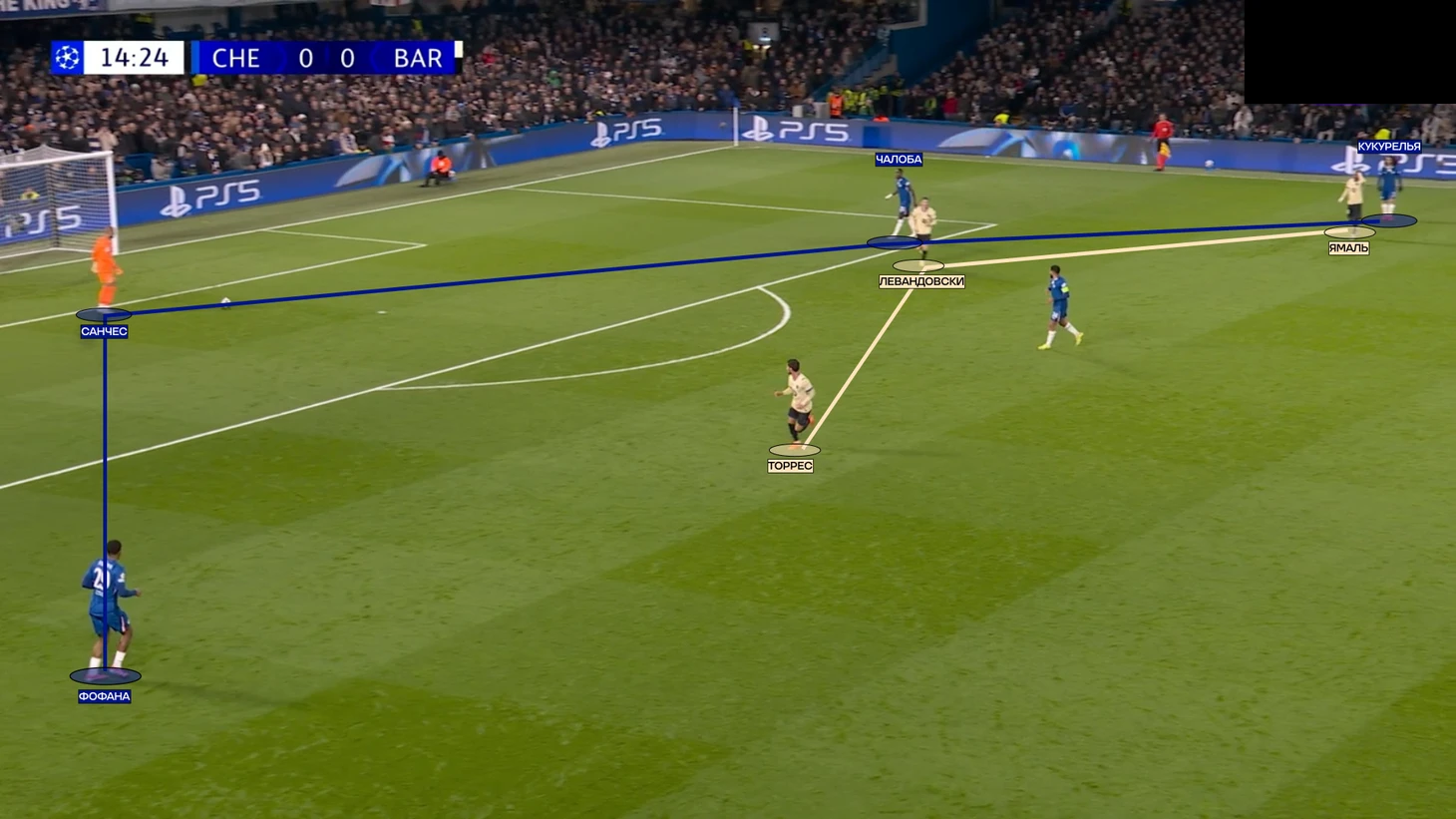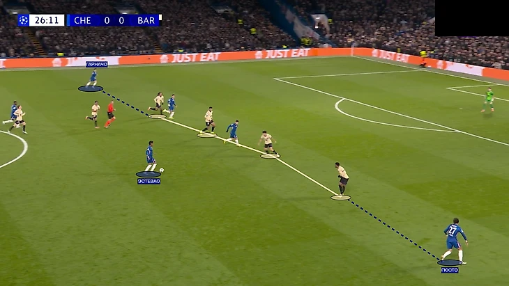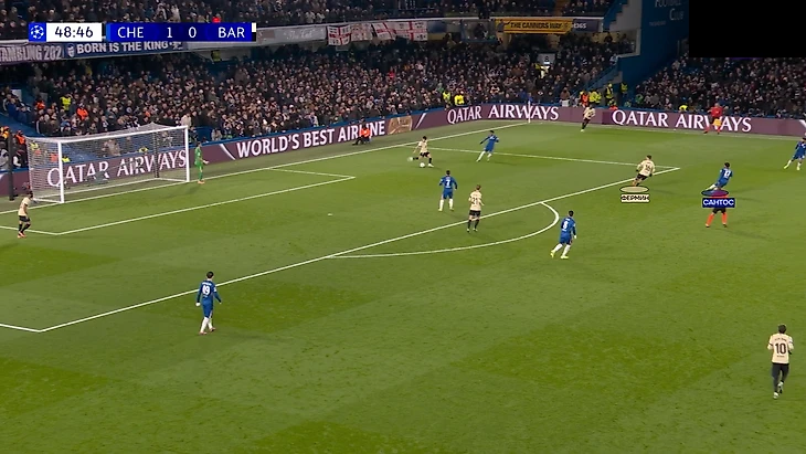 Помните, я писал про разрывы между линией защиты «Барсы» и флангов «Челси»? Стоит вспомнить, потому что в моменте с третьим голом эта ситуация повторилась.