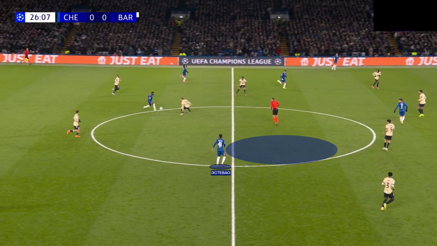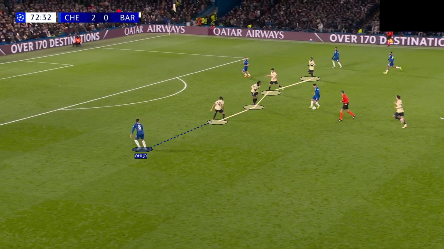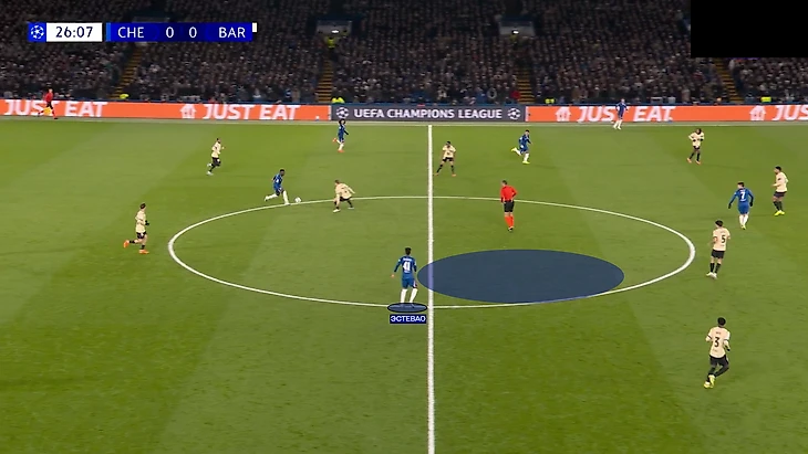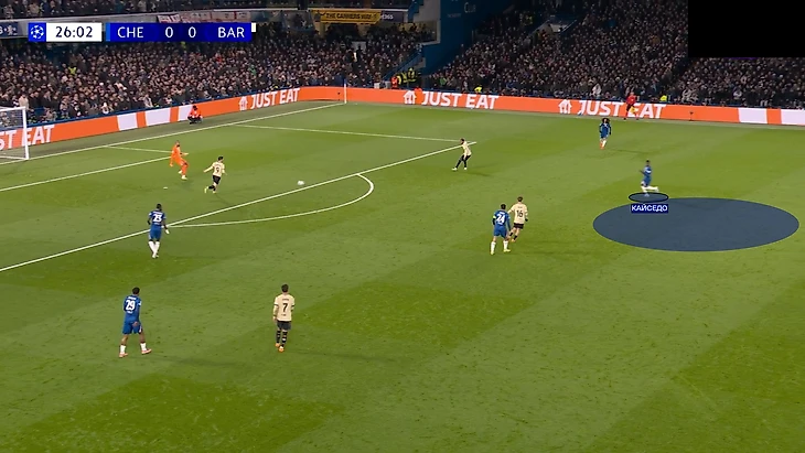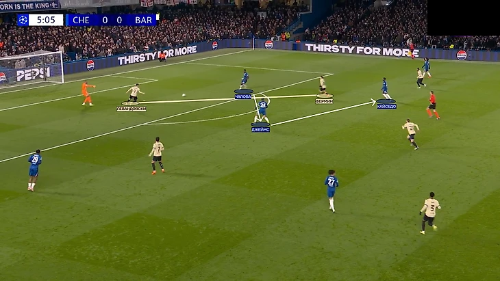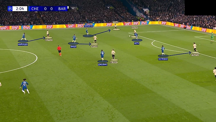 Первый гол «Челси» пришел как раз с удачного выхода из-под давления через центр поля. Конечно, здесь есть и вина «Барсы». В начале атаки центр поля совсем не поддержал прессинг первой линии, что позволило пройти передаче на Кайседо.