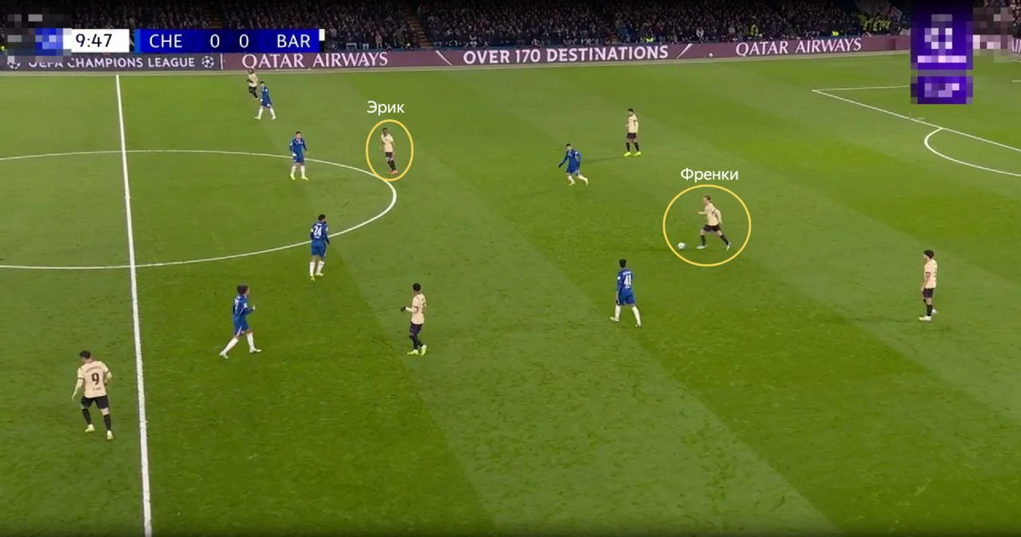 По ходу матча можно вспомнить множество удачных выходов из-под давления «Барсы», но все они объединяются в возможных сценария. В этих эпизодах есть общая черта – хозяева разыгрывают коротко, подключая Санчеса к билдапу. Таким образом, хозяева провоцировали гостей пойти в прессинг, то есть, создать необходимые разрывы для последующей передачи. Помогало расположение вингеров Ямаля и Феррана, которые находились между центральными и крайними защитниками. Подключение Санчеса создавало суету и легкое непонимание, куда и кого прессинговать. Да и в защитной линии «Челси» имел преимущество 4 против 3.