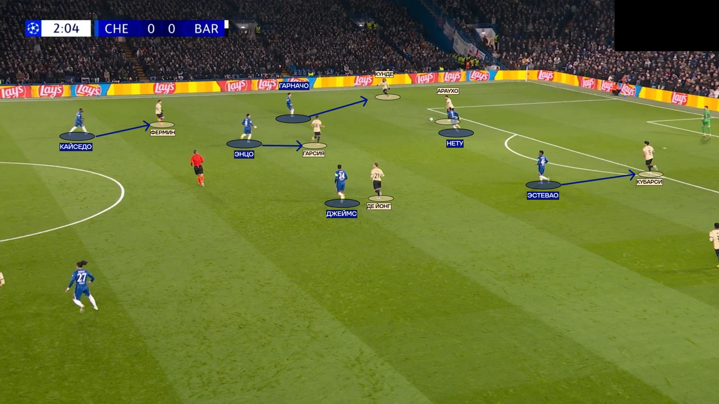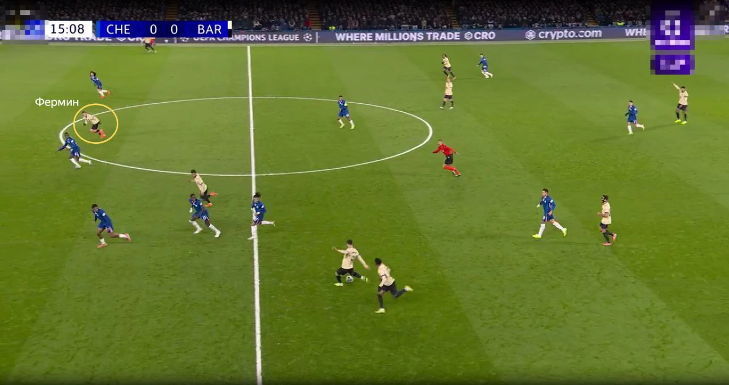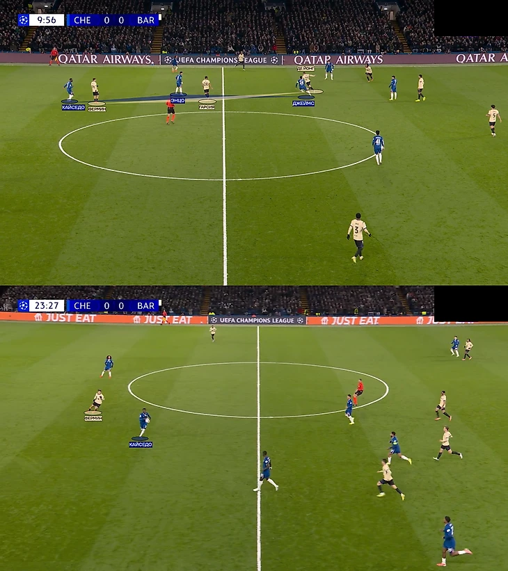 Но самое интересное скрывалось в центре поля – тотальная персоналка треугольника «Барселоны». Энцо Фернандес играл по Гарсии, Джеймс по Де Йонгу (единственному креативному игроку в опорной зоне), а Кайседо блуждал по полю за Фермином. Иногда эквадорец оказывался даже на одной линии с защитниками «Челси».