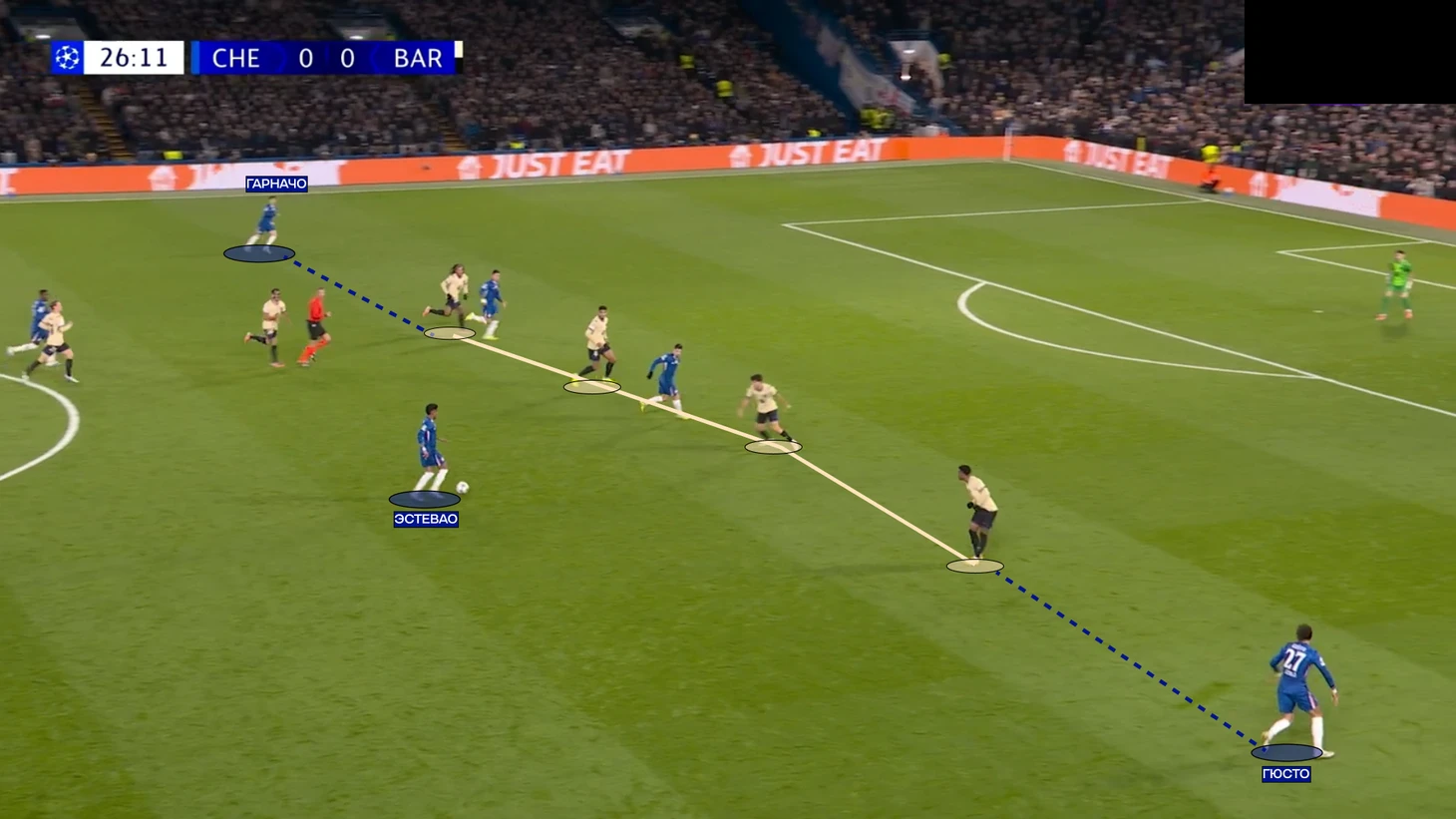 И финальное. Посмотрите, насколько узко располагается четверка защитников каталонцев. Банальная широкая позиция Гюсто и Гарначо уже создает прецедент для скорого прострела или навеса с фланга, так как времени на подготовку достаточно.