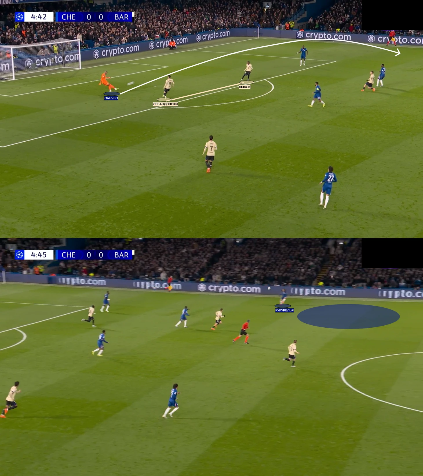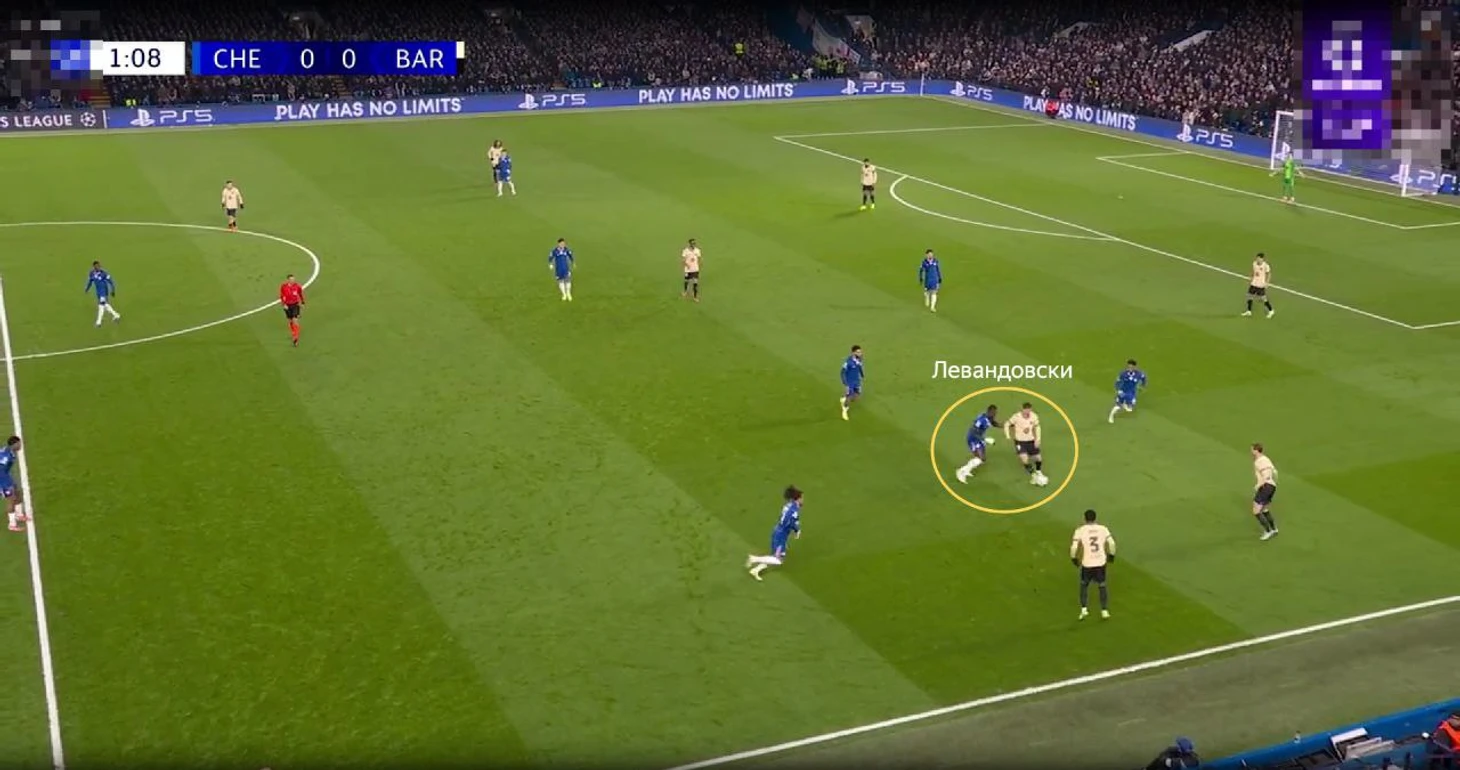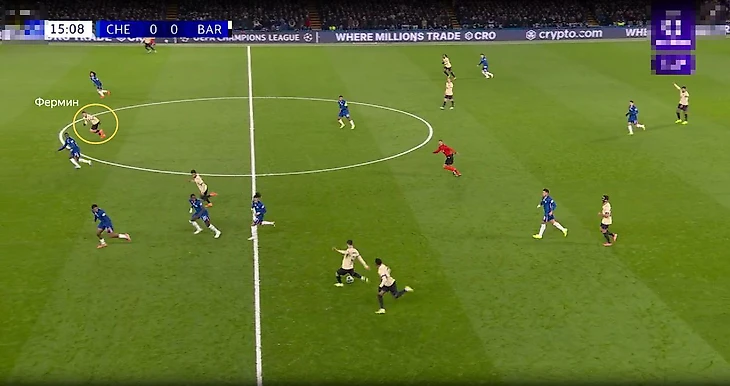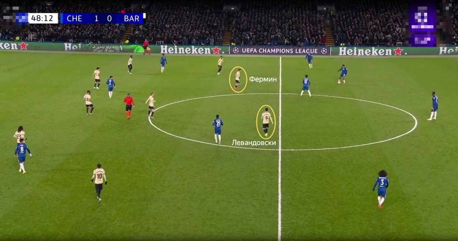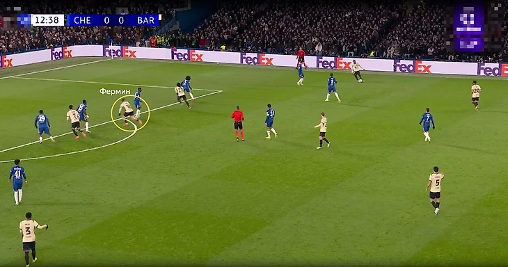 Сценарий первый. Фермин реагирует на движение и идет в прессинг к Левандовскому. Тогда «Челси» получает перевес в центре 2 в 1, так как у «Барсы» остается только Де Йонг. Центральный канал уплотнен игроками и довольно компактен, поэтому «Челси» мог и привезти себе же момент: вспоминаем удар Феррана на первых минутах. Но в целом, это выманивание и концепция выхода из-под прессинга работала, что позволяло команде Марески быстро выбегать в атаку.