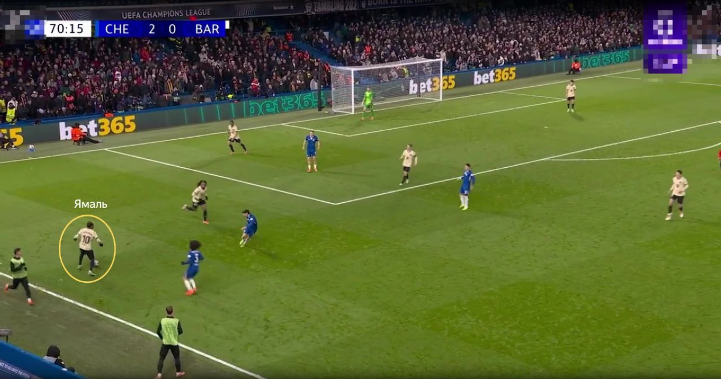 Сценарий второй. Ямаль выходит в первую линию. Тогда все становится куда безопаснее. Ламин оставляет зону, где дежурит Кукурелья. Роберт Санчес или Трево Чалоба верхней передачей проходят прессинг гостей. В результате, Марк получает открытое пространство впереди, так как Кунде занят Гарначо, которого нельзя оставлять на пространстве.