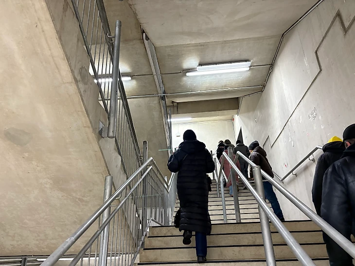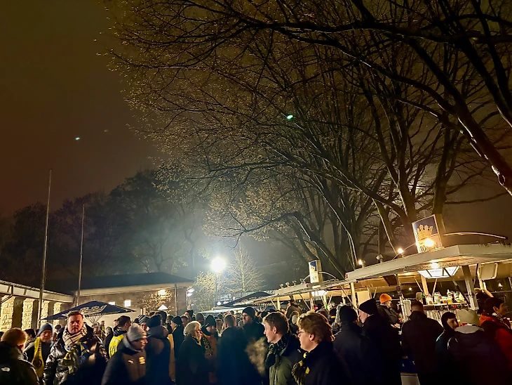 15 минут на подземном трамвае от ЖД вокзала и я оказался непосредственно перед стадионом. Почти сразу же начинаются палатки с едой и напитками. Атмосфера мрачноватая скорее из-за слабого освещения, и стоять в толпе не хочется.