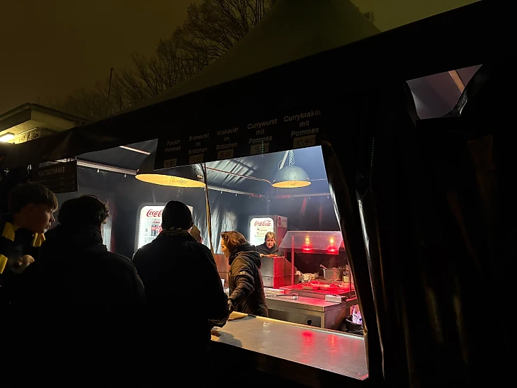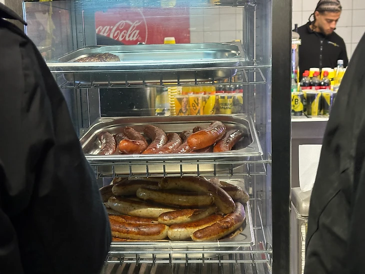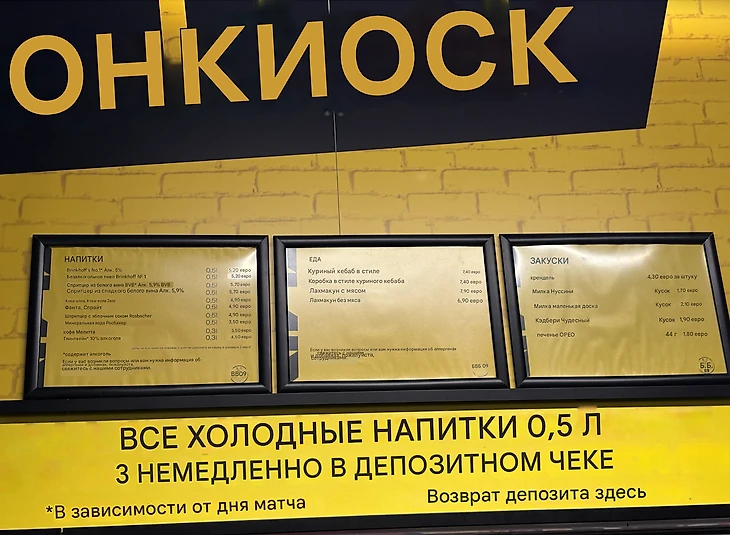 На каждом ярусе есть кафе, где можно купить еду и напитки: несколько видов сосисок, 3 вида пива, глинтвейн и всякие лимонады. Я перевел меню через переводчик, можно оценить цены на стадионе.
