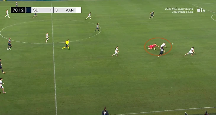 В финале Запада «Ванкувер» на выезде обыграл «Сан-Диего» – 3:1. Неудачно матч сложился для мексиканского вратаря калифорнийцев Пабло Сисниеги, на которого сначала записали автогол, а в концовке он еще и удалился. Снес соперника, оказавшись далеко от ворот.