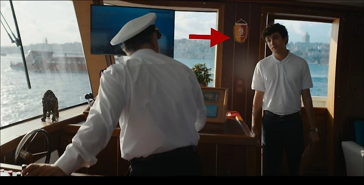 Теперь обратим внимание конкретную сцена этого фильма, где капитан яхты разговаривает со своим помощником и удивляется тому, что пьяные русские ещё не разнесли его судно. А заодно взглянем на вымпел, который висит на стене на капитанском мостике. При некотором увеличении можно разглядеть эмблему…стамбульского «Галатасарая».