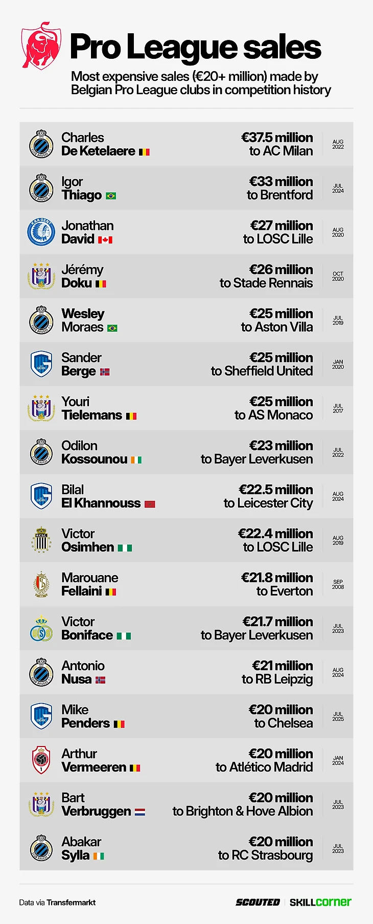 Клубы Бельгийской Про-лиги постоянно находят недооценённых молодых талантов со всех уголков мира, подписывают их, развивают, а затем продают с значительной прибылью. Такой подход помог бельгийским командам успешно выступать в клубных турнирах УЕФА.