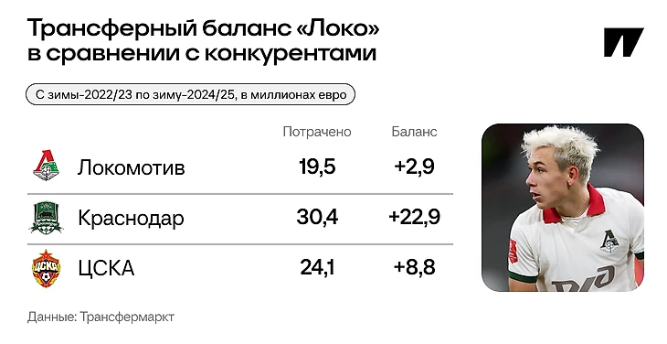 Трансферный баланс последних лет тоже намекает на нерешительность спортивного блока. «Краснодар» и ЦСКА за последние два сезона тратились больше, но в то же время и плюс у них выше, чем у «Локомотива». Летние трансферы-2025 пока не учитываем, потому что их влияние на результат увидим только по итогам сезона. Стартовая точка – зима-2022/23, первое трансферное окно при Нагорных в «Локо».