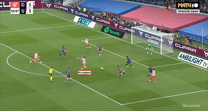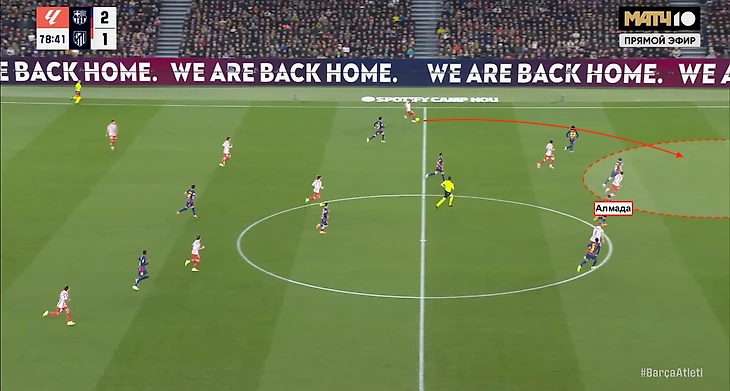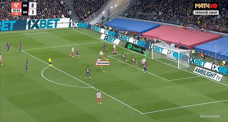 На 79-й минуте «Барса» едва не пропустила, и снова с переходной фазы. Крайне уязвимое место каталонцев. После отбора «Атлетико» доставил мяч в свободную на фланге зону, и для игрока в очередной раз открылось пространство для передачи на нападающего.