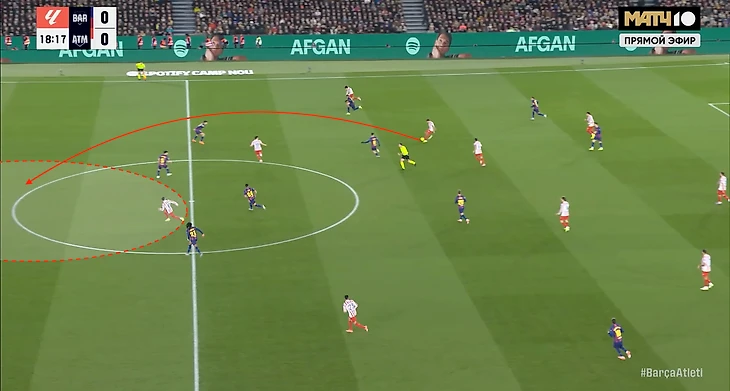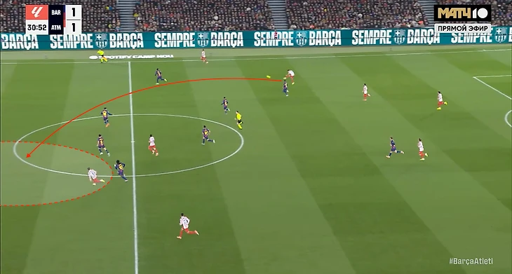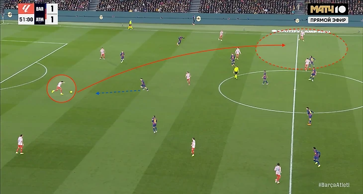 «Атлетико» делал акцент на такое развитие атаки. Если мяч был открытым в средней трети поля, следовал заброс либо перевод мяча на другой фланг. К такому движению мяча «Барселона» уязвима.