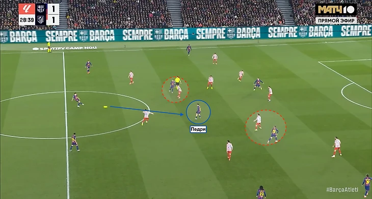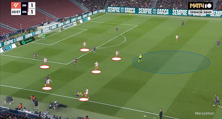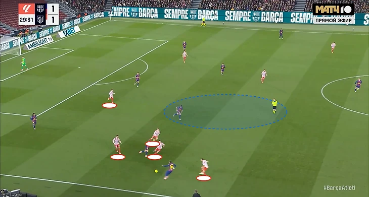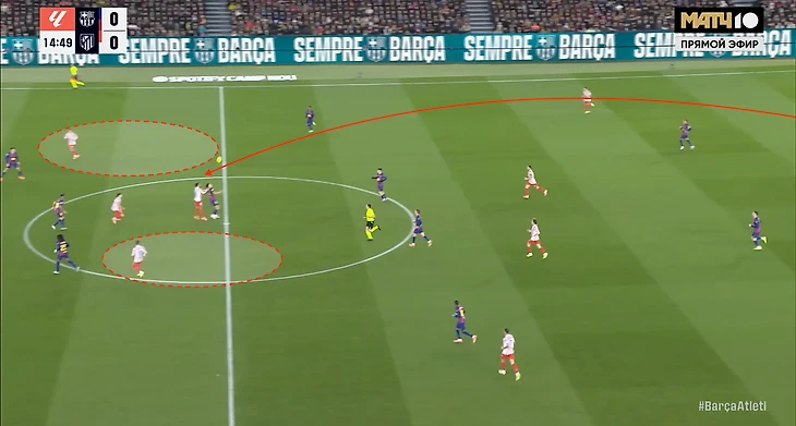 Таким образом, «Атлетико» стремится зажать соперника на краю поля и отобрать мяч. Но «Барселона» находила зоны для преодоления давления.