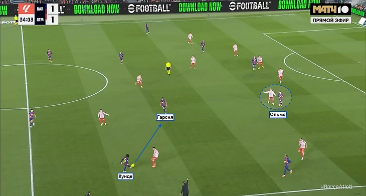Один из характерных эпизодов закончился заработанным пенальти на Ольмо. Началось всё с передачи от Кунде на свободного в центре поля Гарсию. Отметим, что теперь в линию к пятерке защитников из опорной зоны опускался еще один игрок. Здесь он держал Ольмо.
