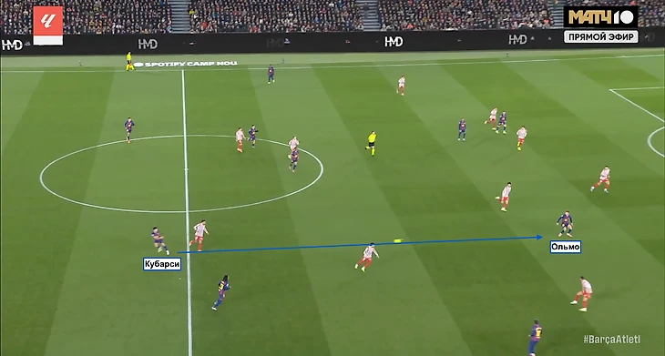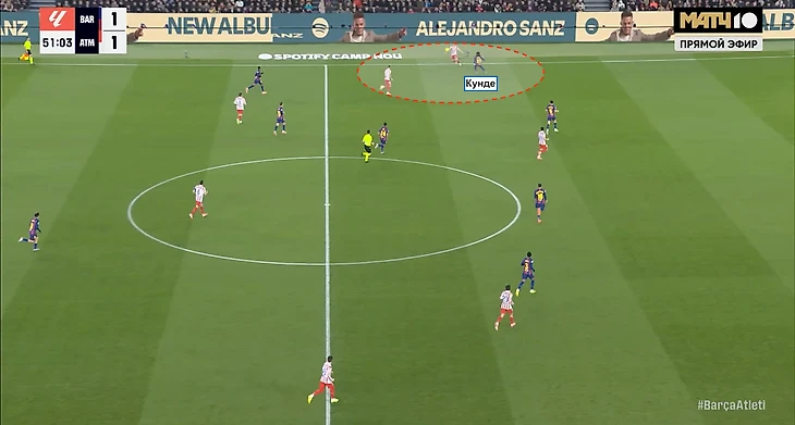 При активном прессинге стабильно остаются оголенными зоны на флангах перед крайними защитниками. Кунде или Бальде вынуждены выдвигаться и встречать оппонента, но с вместе с этим открывают спину. Передачей верхом достаточно легко можно было их отрезать.