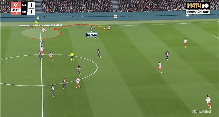 Так как «Атлетико» в фазе позиционной обороны в схеме 5-2-3 был намерен контролировать широкие позиции Бальде и Ямаля как вингеров, уязвимыми оказались зоны между центральными и крайними защитниками.