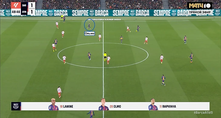 Но вернемся к Ольмо. Во втором тайме Дани нашел выход от такой плотной опеки в полуфлангах — стал просто уходить в ширину, тогда как Ямаль затягивал крайнего защитника выше.