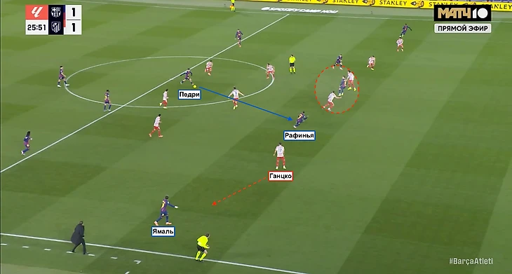 Отличное открывание Рафиньи под передачу от Педри. Уже отметили, что крайние защитники старались контролировать ширину атаки «Барсы». Отсюда и такое расположение Ганцко. Не готов к рывку Рафиньи, держит в голове Ямаля.