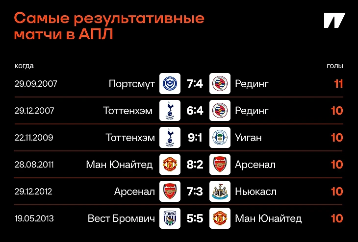 За 33 года существования Премьер-лиги набралось всего 6 матчей, где команды не остановились на 9 мячах.