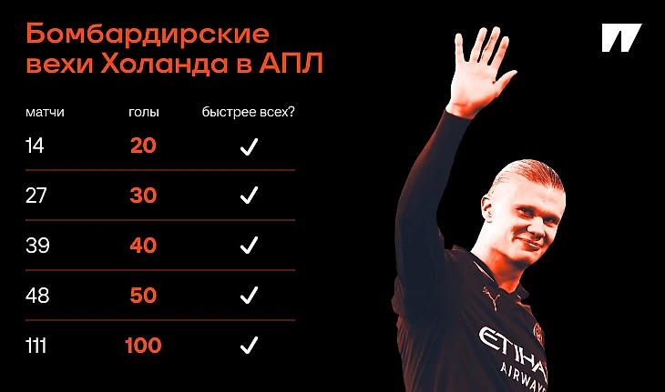100 голов за 111 матчей в АПЛ. Голы каждой из команд, против кого Эрлинг играл. Голы на всех стадионах лиги, кроме «Энфилда».