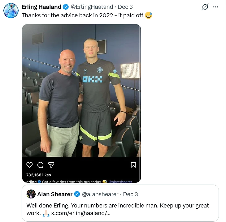 Алан, разумеется, поздравил Холанда: «Так держать, Эрлинг. Твои показатели просто невероятны, парень. Продолжай в том же духе 🙏🏻».