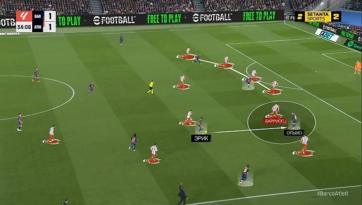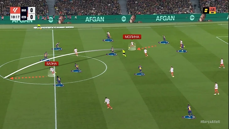 В моменте с победным голом «Барсы» это аукнулось «Атлетико», потому что каталонцы вышли из-под этого давления максимально легко: возник разрыв между прессингующей группой и четверкой защитников, в который спустился Дани Ольмо. Отдельного внимания заслуживает тот факт, что здесь Ольмо и Рафинья снова поменялись полуфлангами, однако выдвигался на Дани все равно Лангле, которому это делать вообще не сподручно, потому что он левый ЦЗ (было бы логичнее Хименесу или Молине выдвинуться):