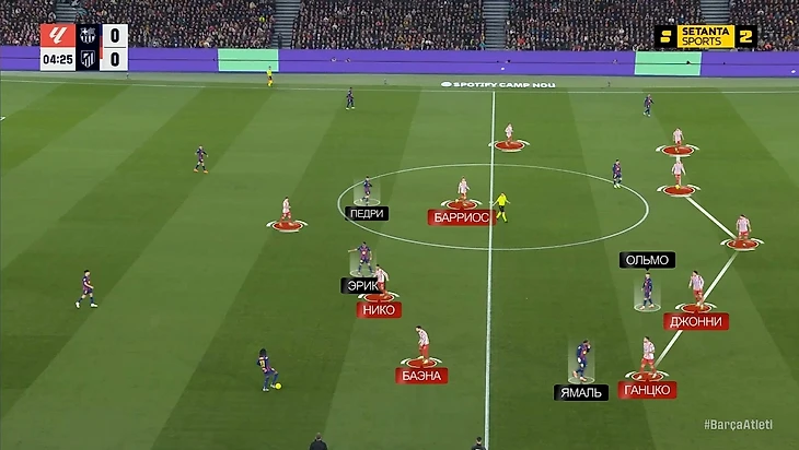 В среднем/низком блоке Джулиано Симеоне садился в заднюю линию и образовывал пятерку. Акцент «Атлетико» делал на перекрытии центра: Джонни, Барриос, Альварес и Нико/Баэна компактно закрывали Эрика, Педри и Ольмо – перевес 4-на-3: