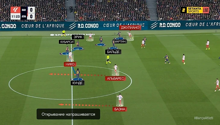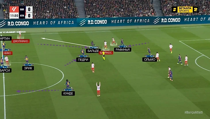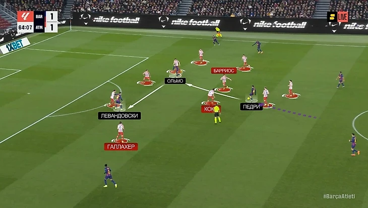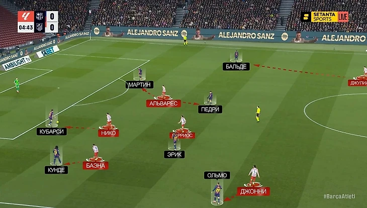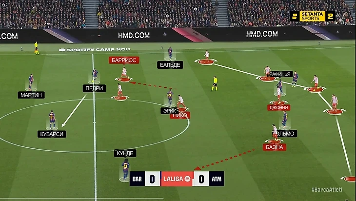 — Педри спускался глубже, вытягивая за собой одного из полузащитников «Атлетико» – пространства в середине становилось больше, плотность обороны «матрасников» уменьшалась. Вот один из примеров еще в начале матча: здесь Педри как раз спустился к защитникам, вытянул за собой Барриоса, и Джонни остался между Рафиньей и Ольмо в полуфлангах. Баэна выдвинулся на Кунде – у Кубарси появился вариант с передачей на Ольмо, что привело к достаточно опасной атаке: