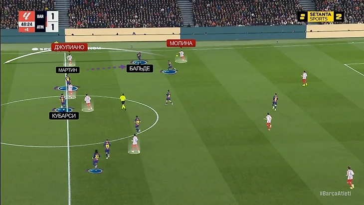 Вот еще одна ситуация: Науэль Молина получает мяч после перевода, и на него так же выдвигается из задней линии Алекс Бальде – за его спиной снова Джулиано Симеоне, а задняя линия «Барселоны» остается только с двумя защитниками. Этот эпизод закончится желтой карточкой Жерара Мартина в конце первого тайма – вынужден был подчищать: