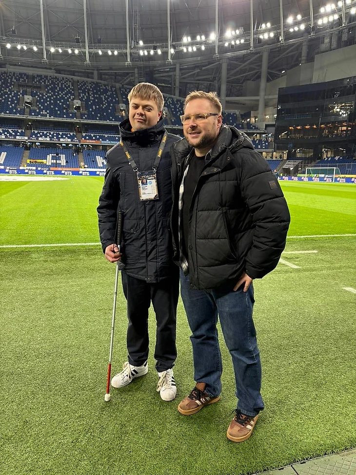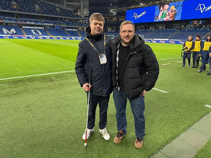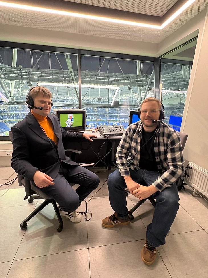 До начала матча у нас было около получаса, чтобы поговорить. Я рассказал о письме, о реакции незрячих болельщиков, о том, как люди воспринимают трансляции на слух. Михаил рассказал о своей подготовке, о том, как структурирует работу во время матча, как подбирает тон, как распределяет внимание между экраном, полем и информацией в наушнике. Это был спокойный и содержательный разговор – тот самый, когда сразу понимаешь, насколько человек любит свою работу.